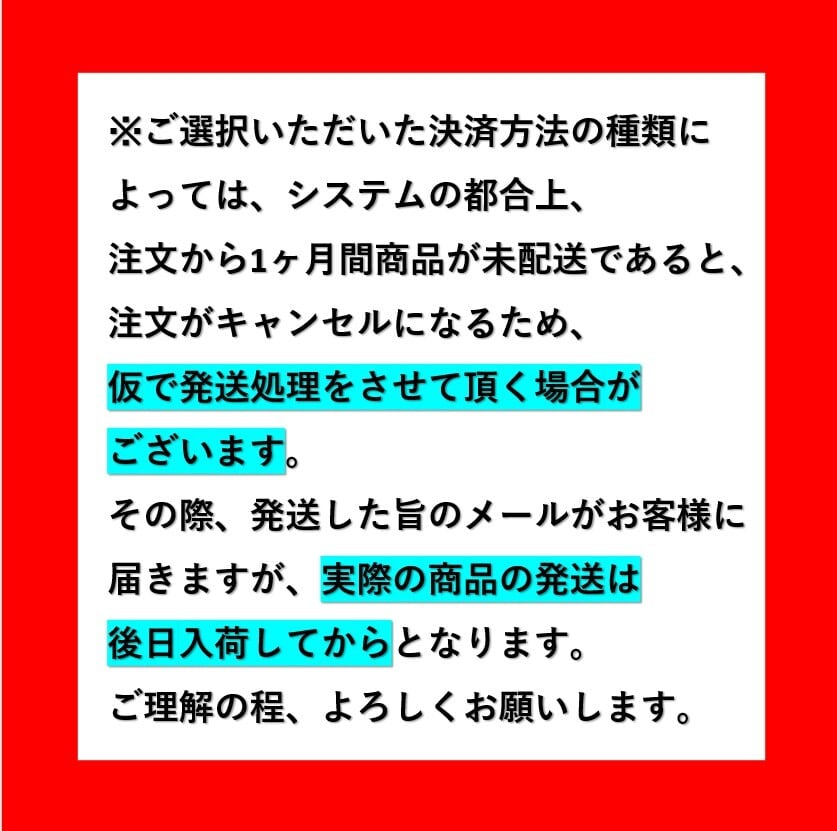 また、ご選択いただいた決済方法の種類によっては、システムの都合上、注文から1ヶ月間商品が未配送であると注文がキャンセルになるため、仮で発送処理をさせて頂く場合がございます。その際、発送した旨のメールがお客様に届きますが、実際の商品の発送は後日入荷してからとなります。ご理解の程、よろしくお願いします。